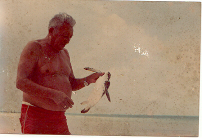 ¿Cómo lo hizo? Bueno, entristecido al ver como en esos años los abundantes huevos de las tortugas sacrificadas junto al muelle fiscal eran tirados y pisoteados, comenzó a trasladarlos a remo hasta Punta Gaviotas, llevándolos en latas de manteca o de galleta de soda.