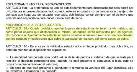 Queda prohibido apartar lugares de estacionamiento en la vía pública, así como poner objetos que obstaculicen el mismo, los cuales serán removidos por los agentes. Corresponde al Ayuntamiento establecer zonas de estacionamiento exclusivo, de conformidad con los estudios y resoluciones que sobre el particular se realicen así como zonas de cobro.”